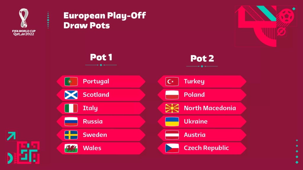Due to the invasion of Ukraine from Russia, Ukraine’s play off against Scotland has been postponed and shall be played in June. Russia has been kicked out of qualifying which means Poland gets a bye.